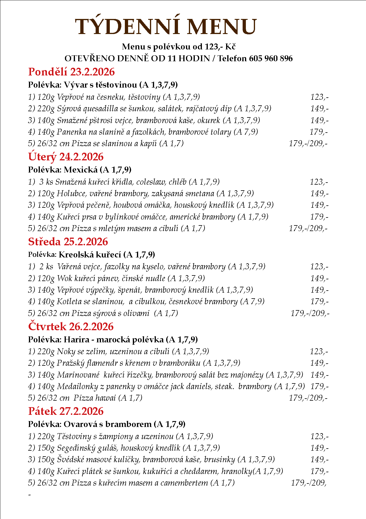 Přes týden vaříme denní menu, k dispozici je výběr ze tří druhů jídel.